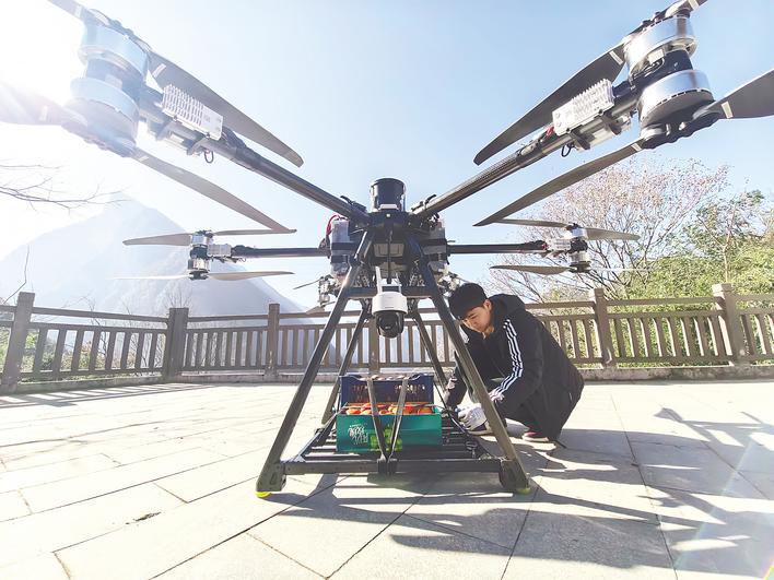 11月29日,冬日温暖的阳光洒满秦巴山的山峦。在一个o鄂西北竹山县官渡镇桃源村的笔下空间,转子的嗡嗡声打破了山间的寂静。湖北云中翼航空科技有限公司运营人员将村民的新鲜水果紧紧地排列在无人机货架上。航线设定完毕,这架银灰色的“空中信使”摘下灯光,承载着大山的恩赐,直飞云雾缭绕的大山深处。