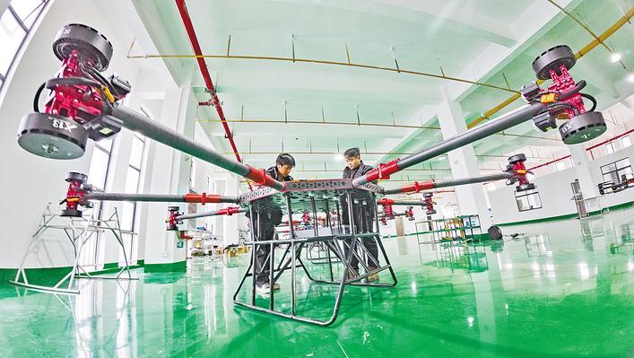 12月8日,在宜昌市夷陵区东城科技创新园宜安科技工厂,技术工人正忙着组装大型运输无人机,准备发往云南。该公司今年年初入驻,研发出一款大型运输无人机,采用8轴16桨叶旋翼布局,额定载重量超过200公斤,抗风能力达到8级,可高效完成空中运输任务。 11月销售额突破1000万元。